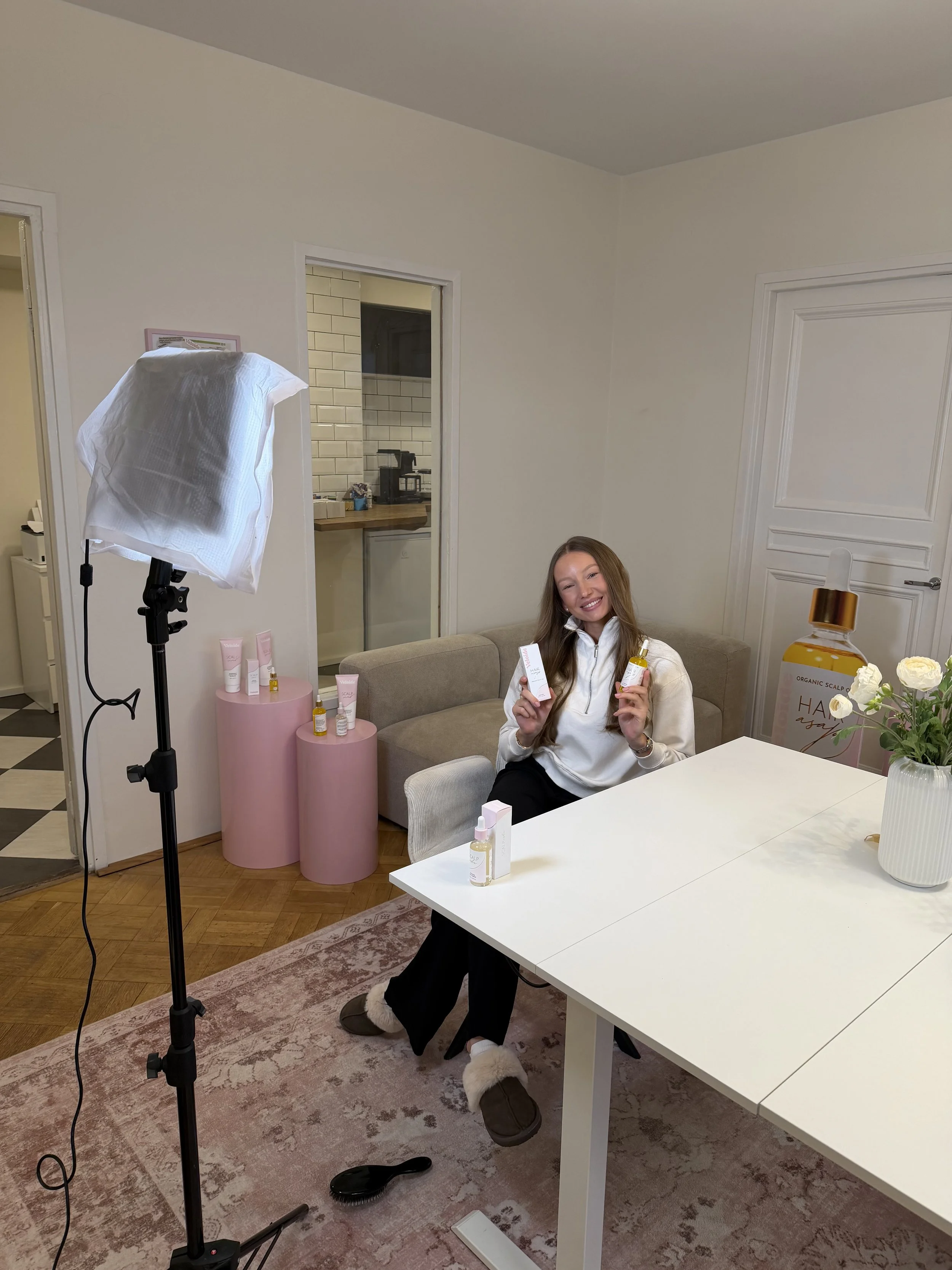 “Somessa alkoi trendaamaan hiustenhoito. Oli selkeää, että on tärkeää hoitaa hiusta sen perustasta lähtien, mutta siihen aikaan Suomesta ei löytynyt mitään sopivaa hiuspohjaöljyä. Päätin tehdä oman yksinkertaisen version ja näin tuloksia.”